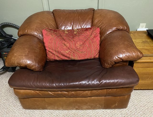 Fine Designs Brown Leather Club Chair, seat has been redone, light wear. Fine Designs Brown Leather Club Chair, seat has been redone, light wear.