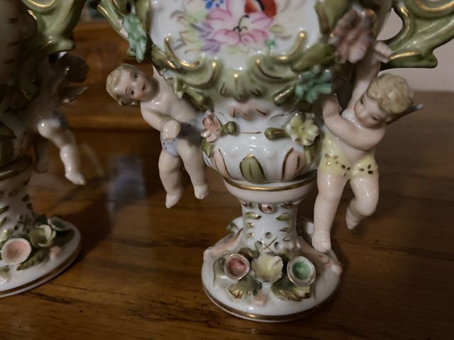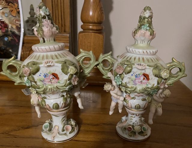 Pair of Dresden Porcelain Urns, flower motif, cherub figurines, hand painted, some chips, cross swords marks. Pair of Dresden Porcelain Urns, flower motif, cherub figurines, hand painted, some chips, cross swords marks.