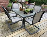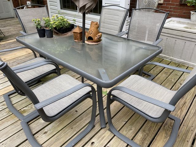 Outdoor Patio Table and Chair Set, metal frame glass top pedestal patio table, and 6 chairs with mesh seats, average condition, included umbrella. Outdoor Patio Table and Chair Set, metal frame glass top pedestal patio table, and 6 chairs with mesh seats, average condition, included umbrella.