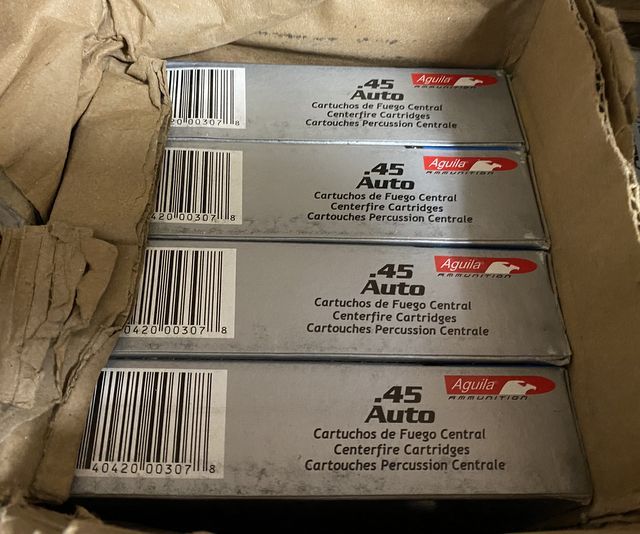 8 Boxes of Aguila .45 Auto, 50 rounds each box. 8 Boxes of Aguila .45 Auto, 50 rounds each box.