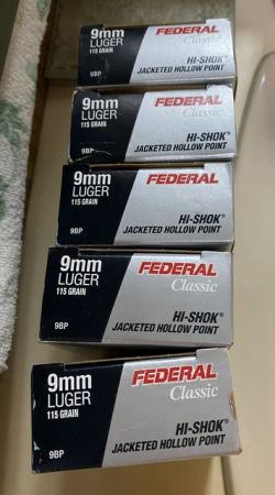 5 Federal 9mm Luger Boxes, 115 grain, jacketed hollow point. 5 Federal 9mm Luger Boxes, 115 grain, jacketed hollow point.