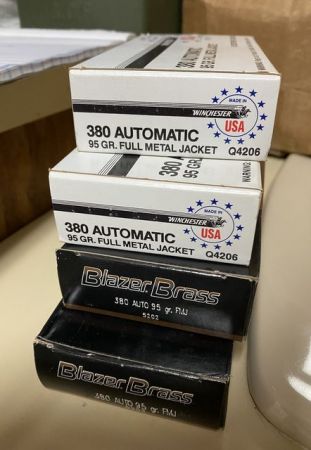 2 boxes of Winchester 380 automatic, 95 grain full metal jacket, 2 Boxes of CCI Blazer Brass, .380 ACP, FMJ 95 grain. 2 boxes of Winchester 380 automatic, 95 grain full metal jacket, 2 Boxes of CCI Blazer Brass, .380 ACP, FMJ 95 grain.