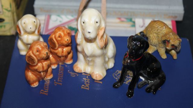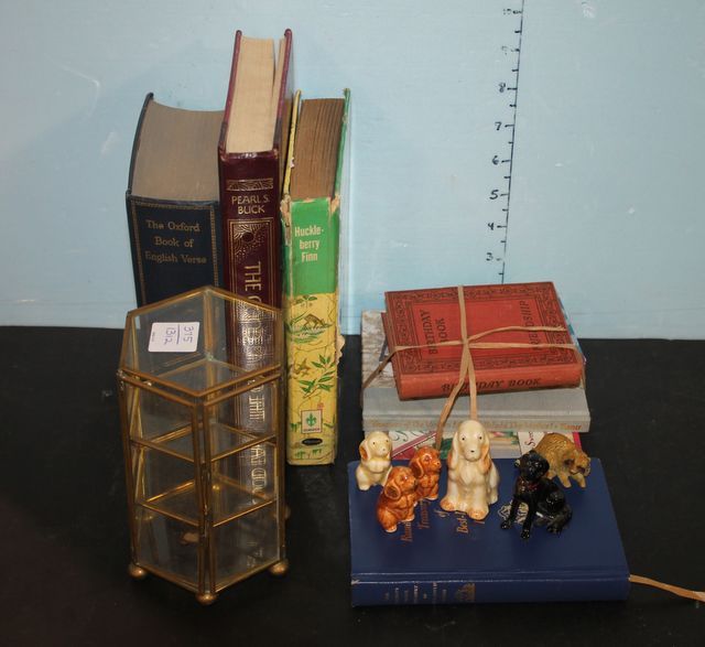 375 Glass Box with Shelves, Small Porcelain Dogs, Small Vintage Books