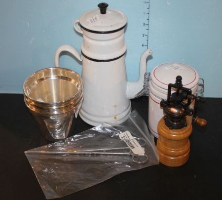 401 Enamel Teapot, Pepper Grinder, Canister, Forceps, Three Silver Tone Pots