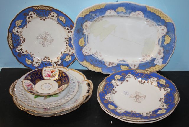 407 Hand Painted Platter, Six Handpainted Plates, and Saucer