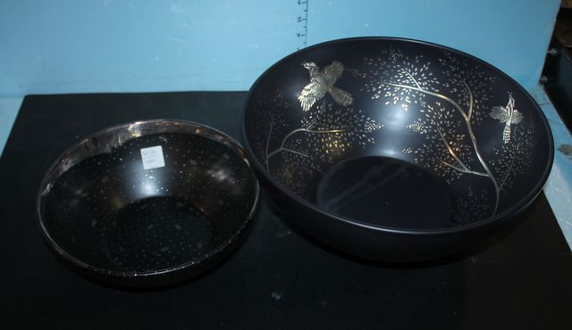 9 1/2", 13 1/2" dia. ; both are pottery with sterling overlay (not marked) 9 1/2", 13 1/2" dia. ; both are pottery with sterling overlay (not marked)