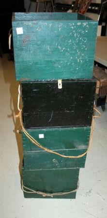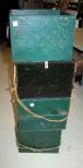 Four Painted Green Crates Crates 14 1/2", 13", 11" ; one crate is missing lid Four Painted Green Crates Crates 14 1/2", 13", 11" ; one crate is missing lid