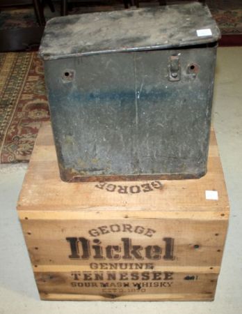 625 George Dickel Whiskey Crate and Tin Box Crate 18", 12 1/2", 13" ; tin box 13", 7", 12"