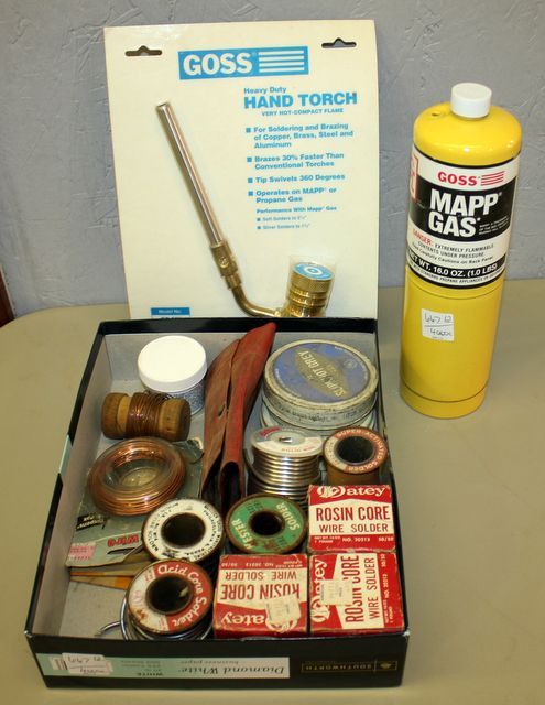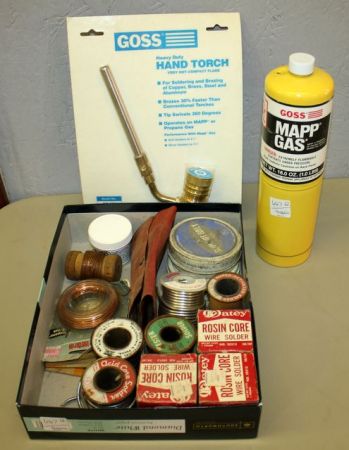 Box Lot Solder wire, hand torch, and can of Goss mapp gas Box Lot Solder wire, hand torch, and can of Goss mapp gas