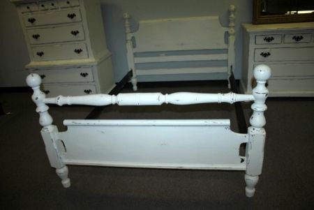 Hand Brushed Distressed White Painted Cannonball Full Size Bed Matches lot #742 and #743 ; 43" h. ; comes with metal rails Hand Brushed Distressed White Painted Cannonball Full Size Bed Matches lot #742 and #743 ; 43" h. ; comes with metal rails