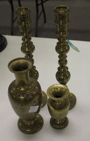 268 Pair of Brass Candlesticks and Two Vases Candlesticks 13"h., Vases 5", 9"h.