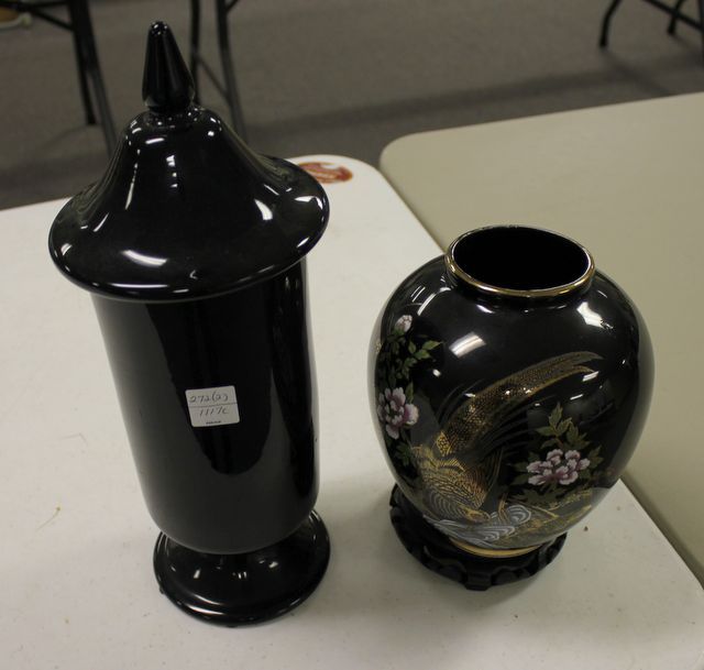 Two Black Glass Pieces One vase with gold decoration on stand 9"h., one covered jar 15"h. Two Black Glass Pieces One vase with gold decoration on stand 9"h., one covered jar 15"h.