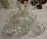 Grouping of Glass Including Six 5" bowls, two small covered dishes 3"dia, pair cruet jars 8"h., butter dish cover. Grouping of Glass Including Six 5" bowls, two small covered dishes 3"dia, pair cruet jars 8"h., butter dish cover.