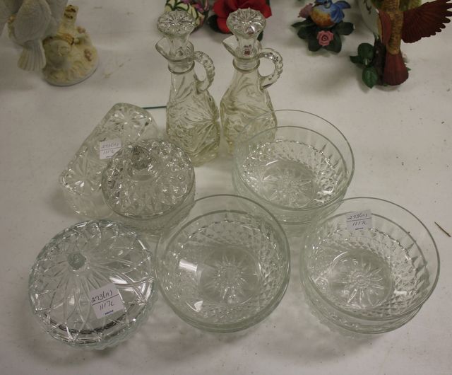 273 Grouping of Glass Including Six 5" bowls, two small covered dishes 3"dia, pair cruet jars 8"h., butter dish cover.