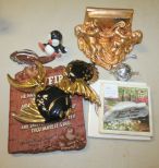 282 Miscellaneous Lot of Small Fish Plagues, Angle Sconce, Two Porcelain Animals, and Wood Plaque