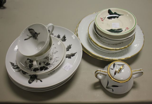 Miscellaneous Plates, Covered Sugar, 4 Matching Dinner Plates, 2 Cups and Saucers. Miscellaneous Plates, Covered Sugar, 4 Matching Dinner Plates, 2 Cups and Saucers.