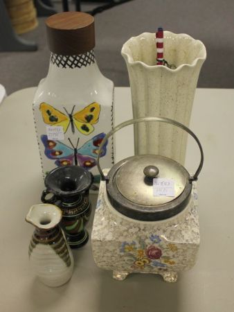 327 Butterfly Decanter, Three Ceramic Vases, English Biscuit Barrel