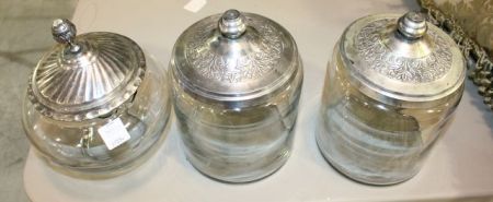 Three Glass Round Jars (one broken at top) Three Glass Round Jars (one broken at top)