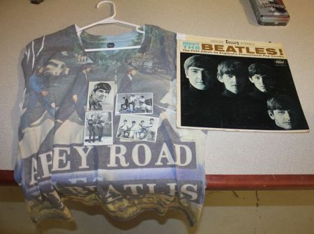 592 Beatles Collectible Items Beatles First Album, Print autographs of the four members on cards, Beatles shirt (1x)