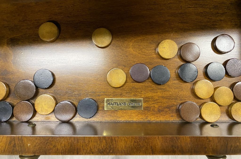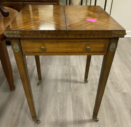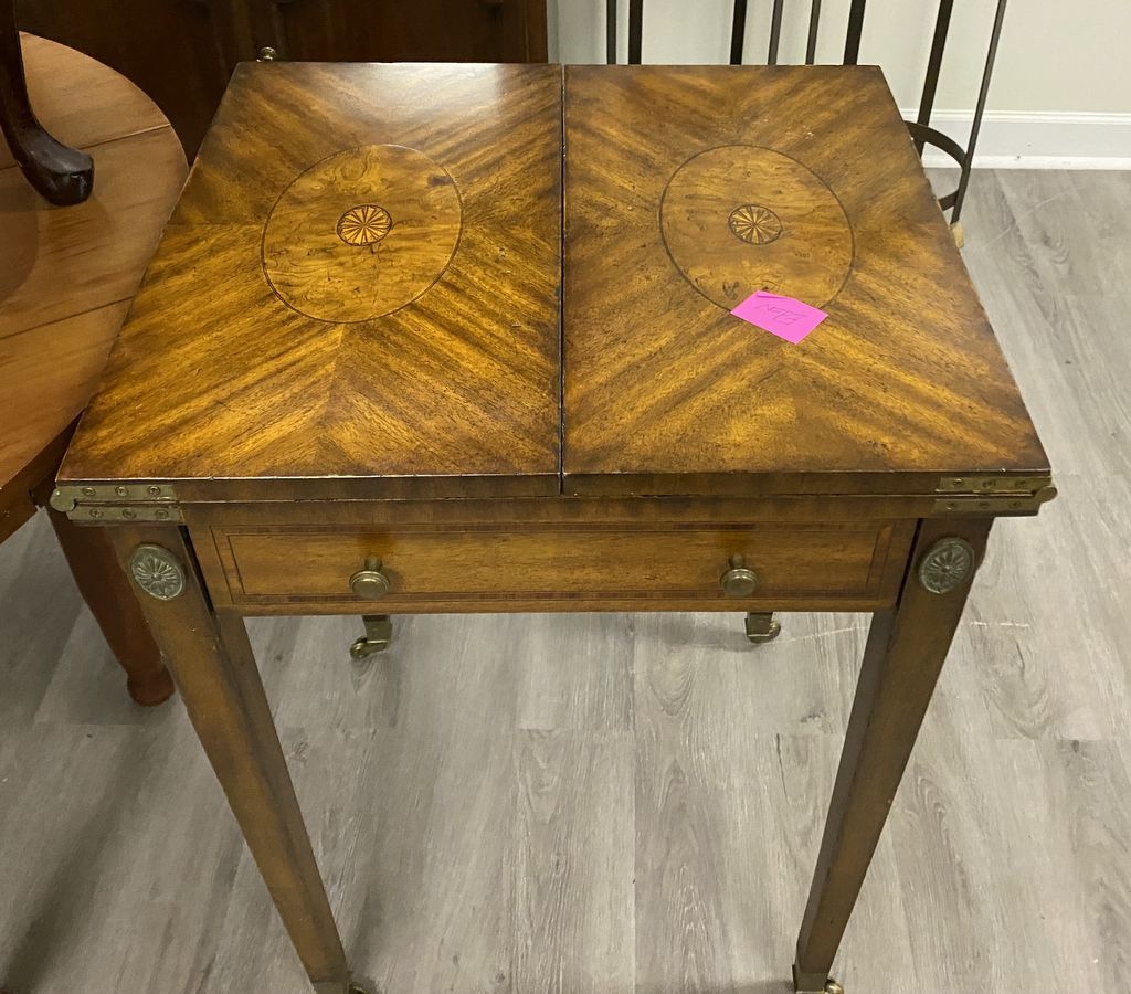 Maitland Smith Checker Board Game Table, fold out top, single drawer with playing pieces, burl mahogany finish, good condition. Location Left Conference Room. 31.5" h., 22" w., 20" d Maitland Smith Checker Board Game Table, fold out top, single drawer with playing pieces, burl mahogany finish, good condition. Location Left Conference Room. 31.5" h., 22" w., 20" d