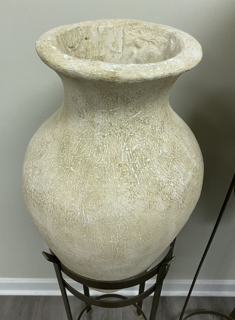 Two pottery vases on stands, different sizes, decorative pieces. Location Left Conference Room. 62" h. and 53" h. Two pottery vases on stands, different sizes, decorative pieces. Location Left Conference Room. 62" h. and 53" h.