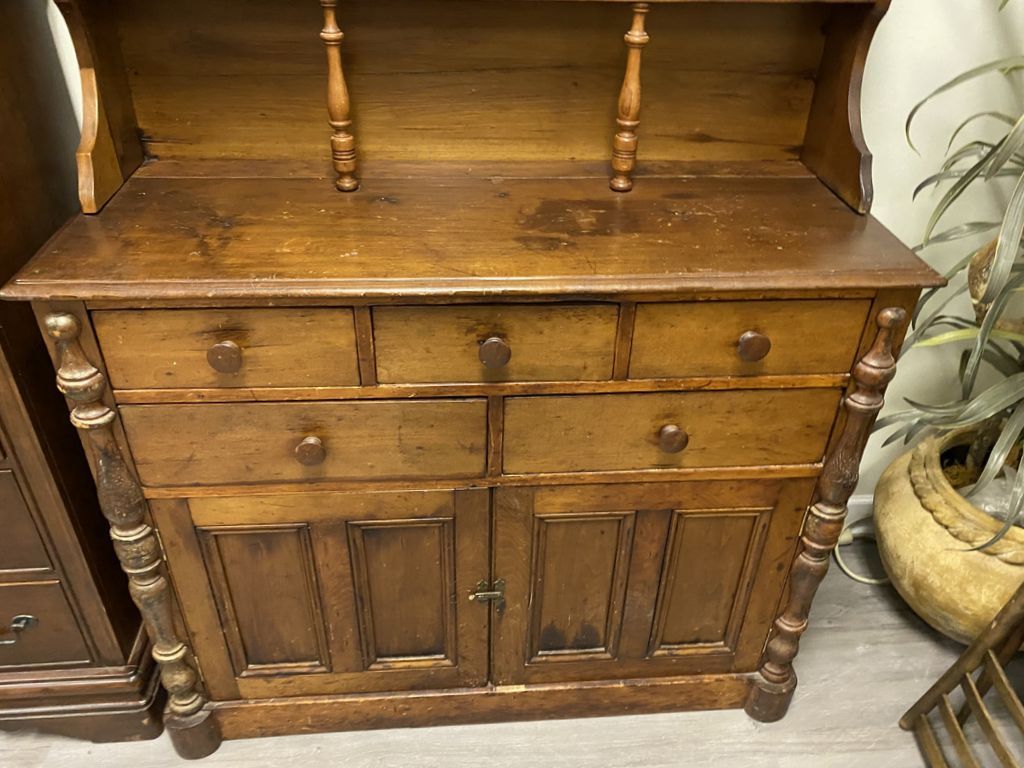 Primitive Style Shaker Hutch, light wear on finish, one piece, drawers, plate rack, solid piece. Location Left Conference Room. 63" h., 48" w., 18" d. Primitive Style Shaker Hutch, light wear on finish, one piece, drawers, plate rack, solid piece. Location Left Conference Room. 63" h., 48" w., 18" d.