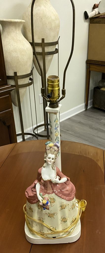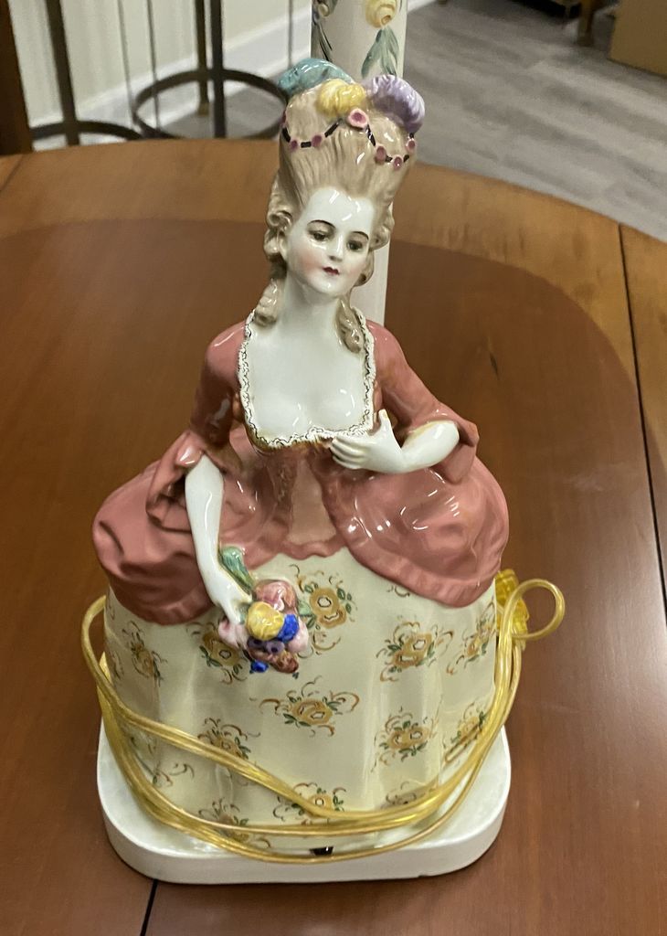 Porcelain Lady Figure Lamp, hand painted, no damage. 27" h., 7" w., 7.5" d. Location Left Conference Room Porcelain Lady Figure Lamp, hand painted, no damage. 27" h., 7" w., 7.5" d. Location Left Conference Room