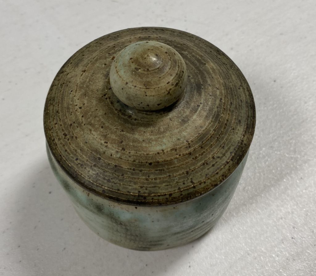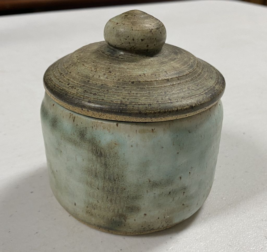 Small Peter's Pottery Jar, nutmeg, with lid, signed P, good condition. Small Peter's Pottery Jar, nutmeg, with lid, signed P, good condition.