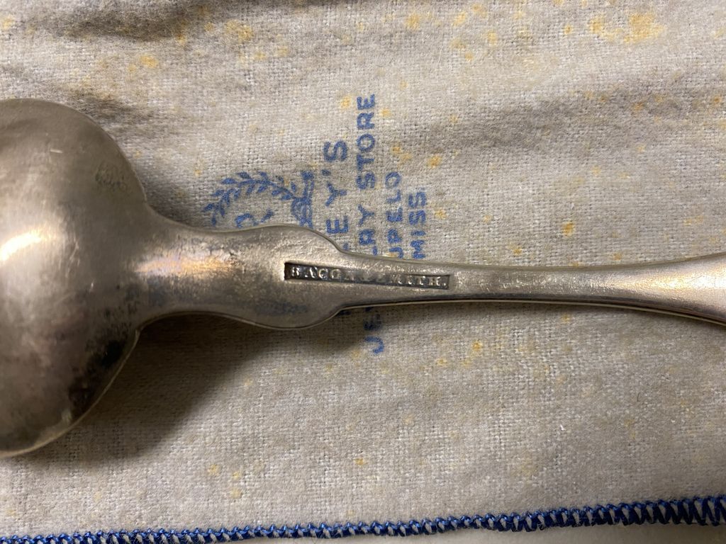 Coin Silver Serving Spoon, makers mark on back, light tarnish. Location Room by Kitchen Coin Silver Serving Spoon, makers mark on back, light tarnish. Location Room by Kitchen