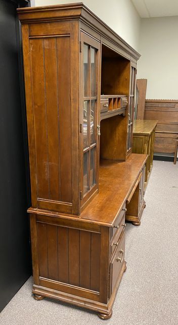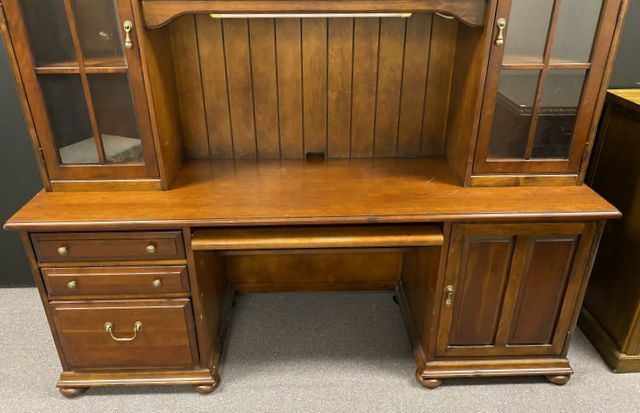 Large cherry computer desk, two piece, top with side bookcase doors, base with keyboard shelf, side storage drawers and door, light finish wear. 77" h., 76.5" w., 24" d. Location Back Large cherry computer desk, two piece, top with side bookcase doors, base with keyboard shelf, side storage drawers and door, light finish wear. 77" h., 76.5" w., 24" d. Location Back