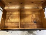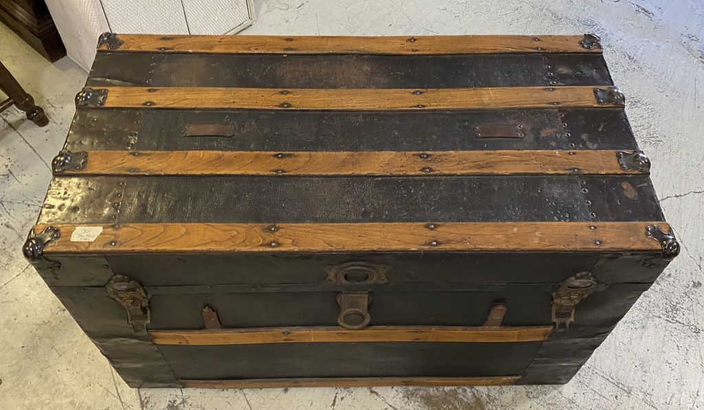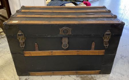 Nice Antique Streamer Traveling Trunk, interior tray, wood and tin exterior, leather handles, good condition, 22"h., 36"w. Nice Antique Streamer Traveling Trunk, interior tray, wood and tin exterior, leather handles, good condition, 22"h., 36"w.