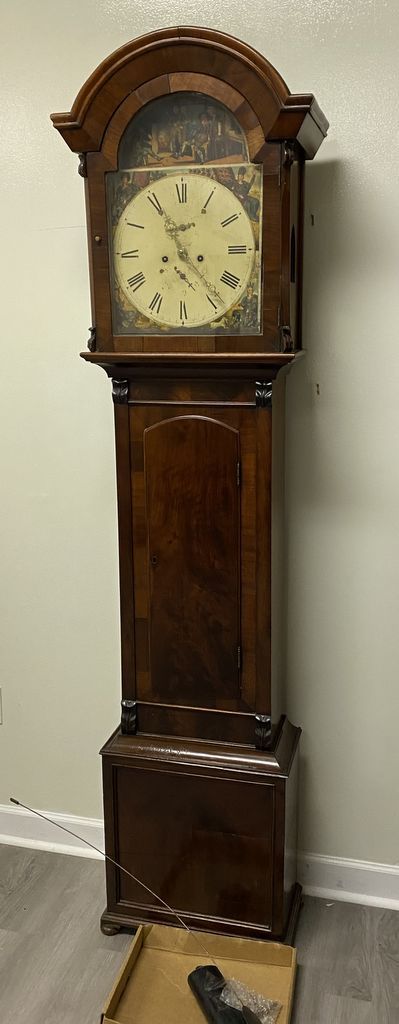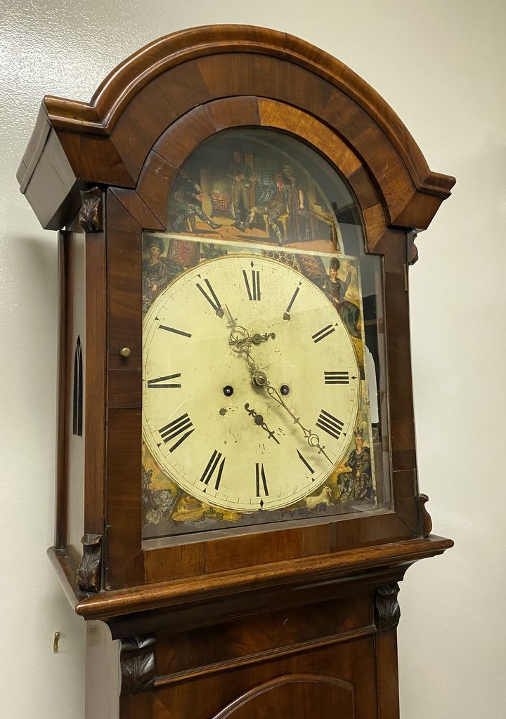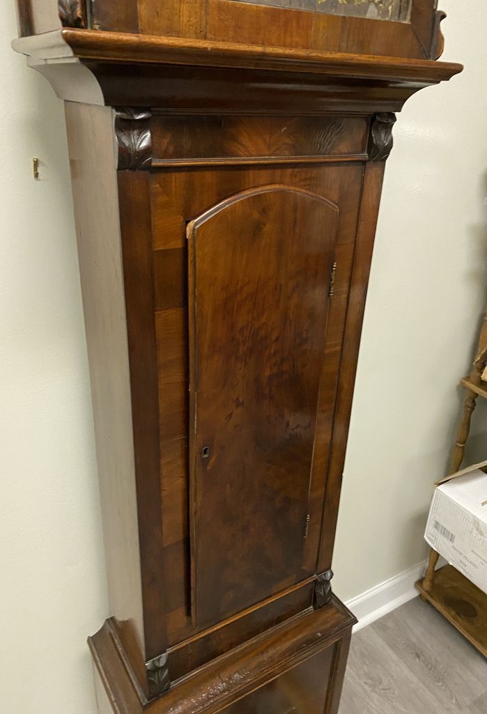 Late 19th Century Grandfather Clock, burl mahogany, crack in glass, has pendulum and weight, untested, good condition. 85" h., 18.5" w., 7" d. Location Left Conference Room Late 19th Century Grandfather Clock, burl mahogany, crack in glass, has pendulum and weight, untested, good condition. 85" h., 18.5" w., 7" d. Location Left Conference Room