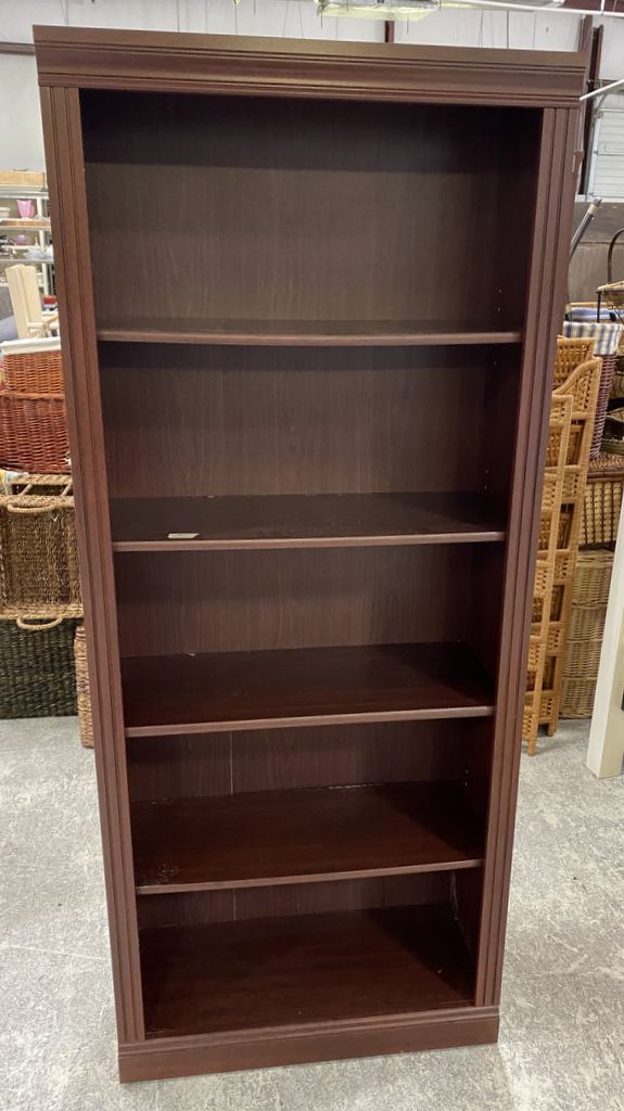 Cherry Pressed Wood Bookcase 72"h., 30"w. Location Room by Kitchen Cherry Pressed Wood Bookcase 72"h., 30"w. Location Room by Kitchen