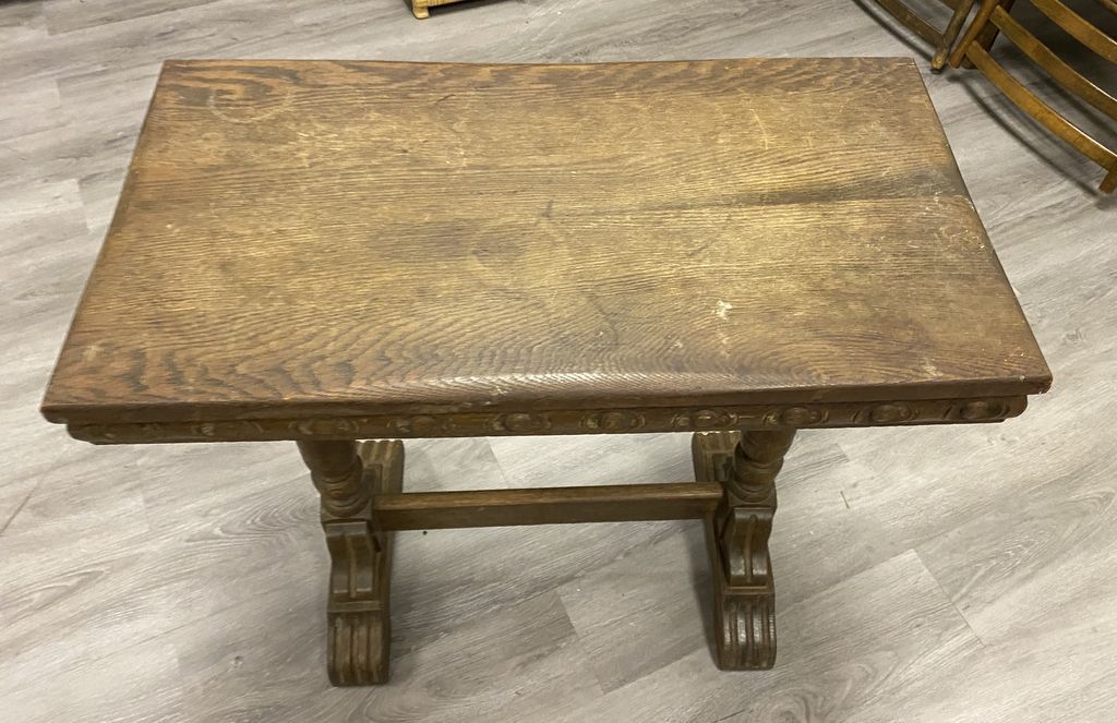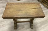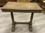 Vintage Oak Small Accent Table, age wear, double pedestal. 25" h., 26" w., 14" d. Location Left Conference Room Vintage Oak Small Accent Table, age wear, double pedestal. 25" h., 26" w., 14" d. Location Left Conference Room