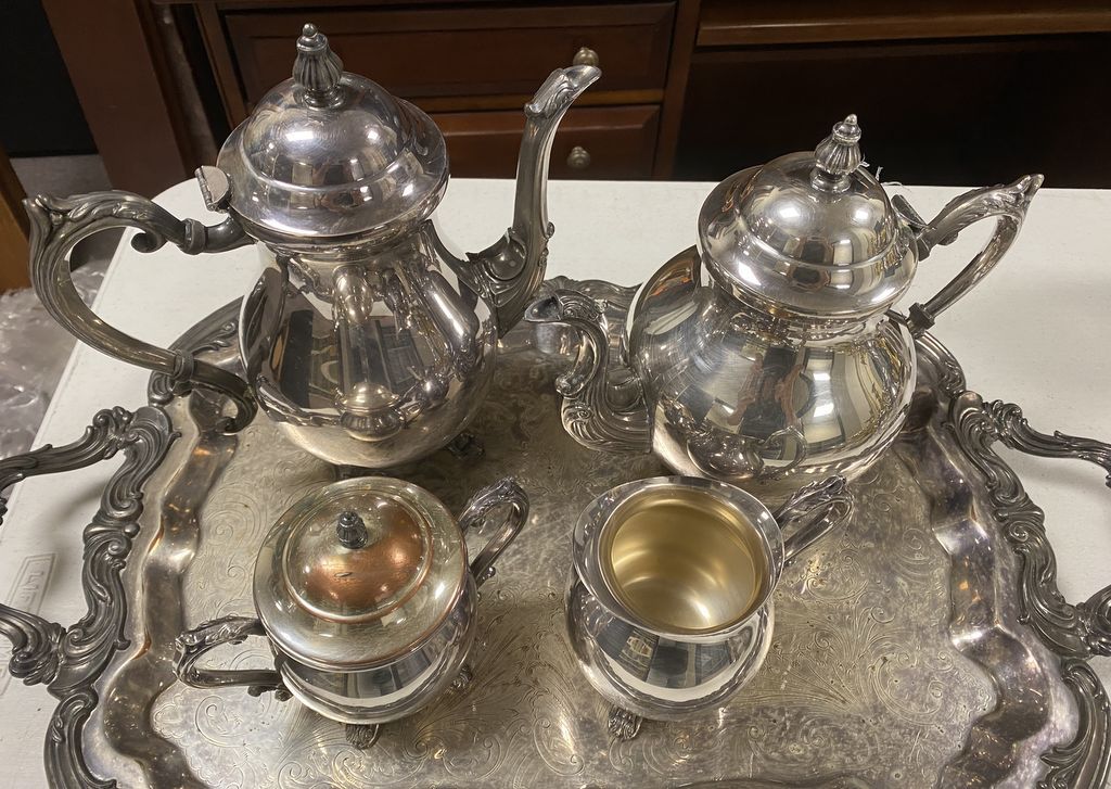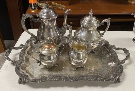 Rogers & Co. Silver Plate Tea Service Set, tea, coffee, sugar, and creamer, tray does not match set, light tarnish. Rogers & Co. Silver Plate Tea Service Set, tea, coffee, sugar, and creamer, tray does not match set, light tarnish.
