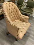 Nice Tan Leather Office Chair, button tufted, on wheels, good condition. 40" h, 26" w., 21" d. Location Left Conference Room Nice Tan Leather Office Chair, button tufted, on wheels, good condition. 40" h, 26" w., 21" d. Location Left Conference Room