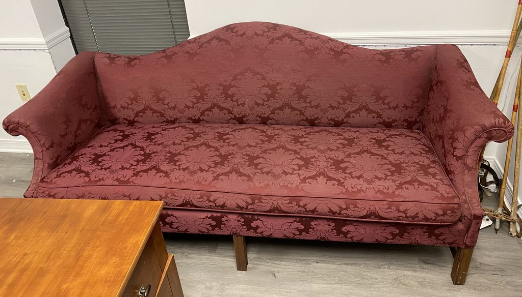 Red Camel Back Upholstered Sofa, single cushion. Location Middle Right office Red Camel Back Upholstered Sofa, single cushion. Location Middle Right office