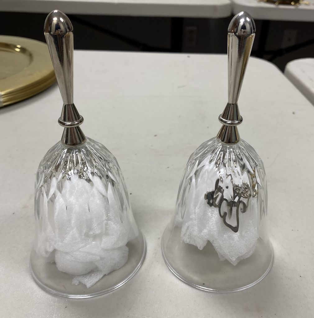 Pair of Crystal Glass Bells, silver plate handled. Pair of Crystal Glass Bells, silver plate handled.