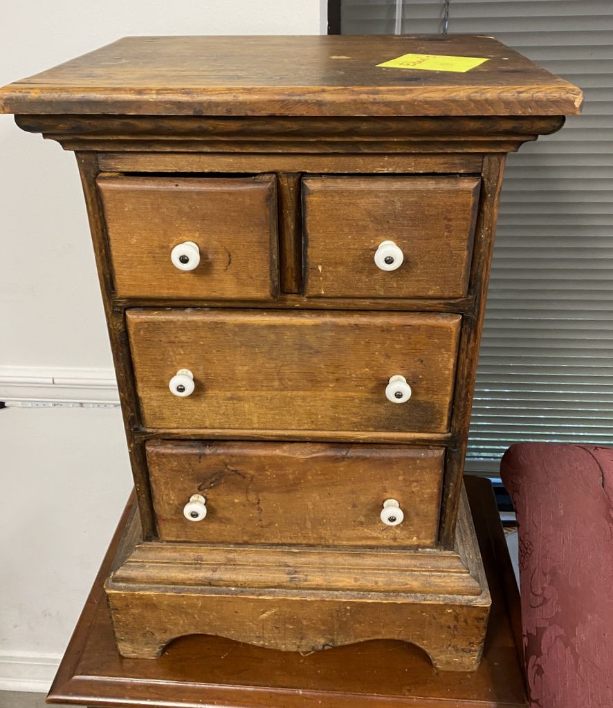 Late 20th Century Primitive Side Table, four drawers, white pulls, light wear, Location Middle right Office Late 20th Century Primitive Side Table, four drawers, white pulls, light wear, Location Middle right Office