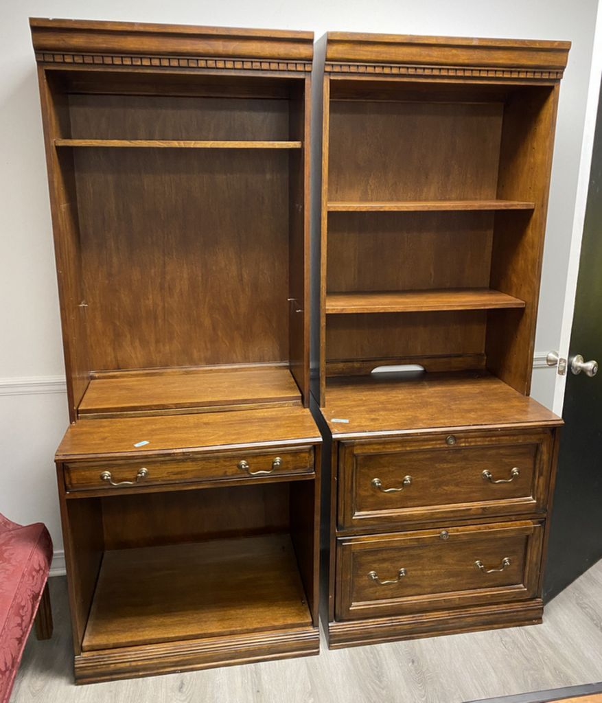 Two Cherry Office Bookcases, matching set, drawers, wood shelves, no damage. Location Middle right Office Two Cherry Office Bookcases, matching set, drawers, wood shelves, no damage. Location Middle right Office