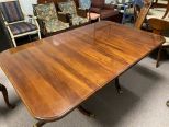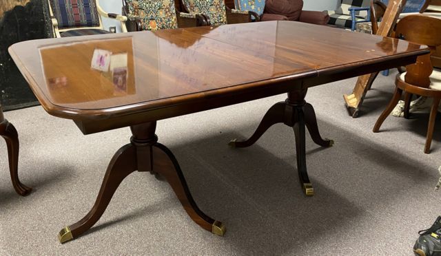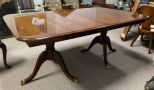 Federal Style Double Pedestal Dining Table, brass cap footed, cherry, reproduction, good condition, 29"h., 67"long,. 40"w. Location Left Office Federal Style Double Pedestal Dining Table, brass cap footed, cherry, reproduction, good condition, 29"h., 67"long,. 40"w. Location Left Office