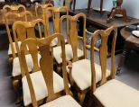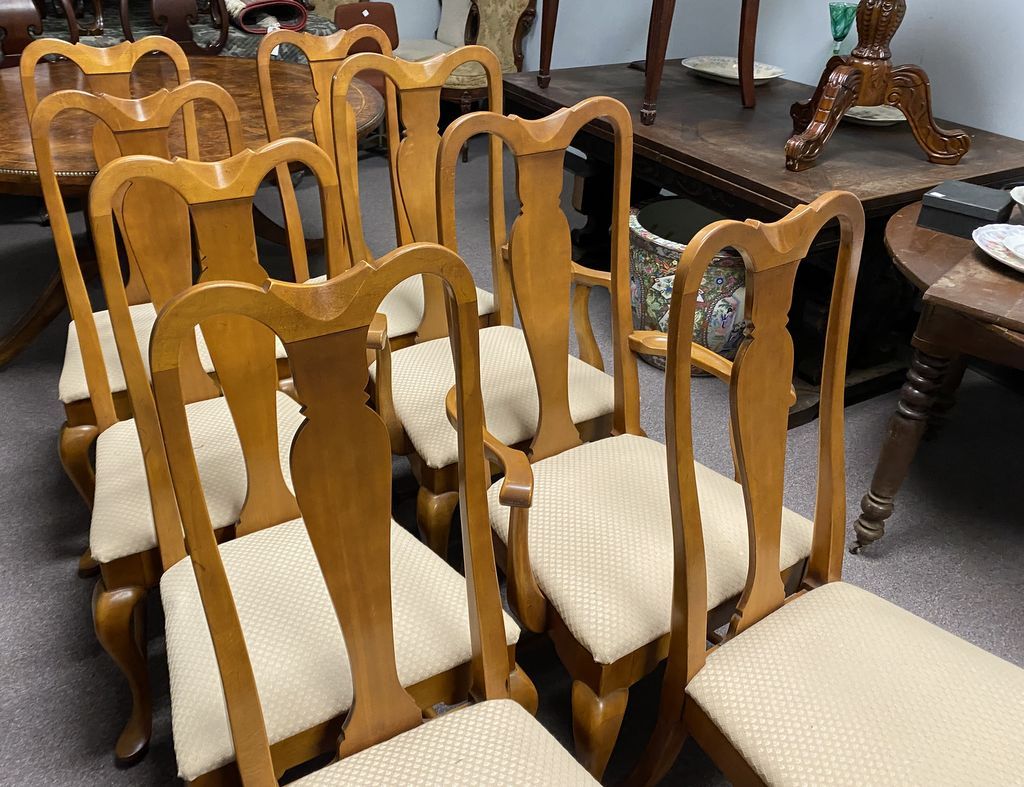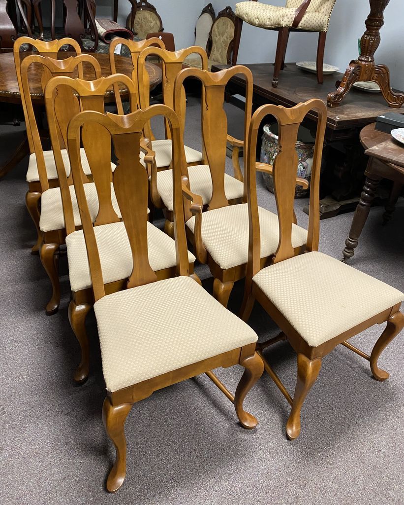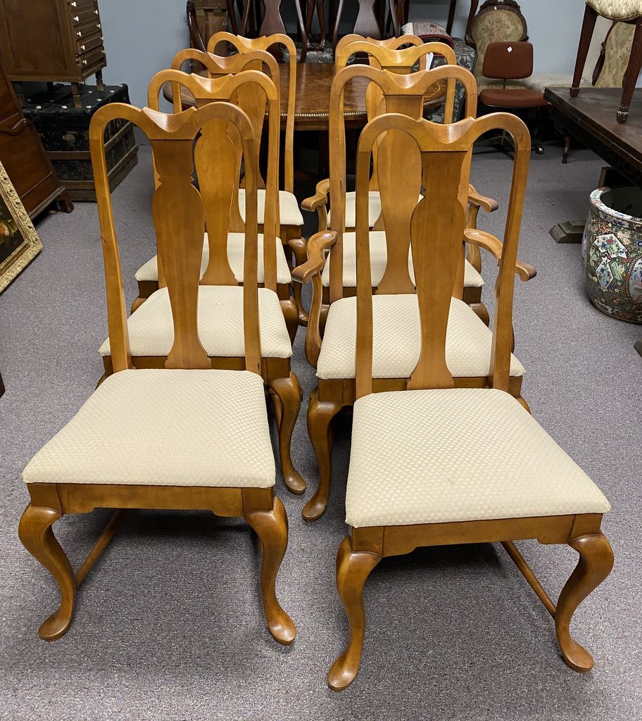 Eight Cherry Queen Anne Dining Chairs, 2 arms, 6 sides, good condition. Location Left office Eight Cherry Queen Anne Dining Chairs, 2 arms, 6 sides, good condition. Location Left office