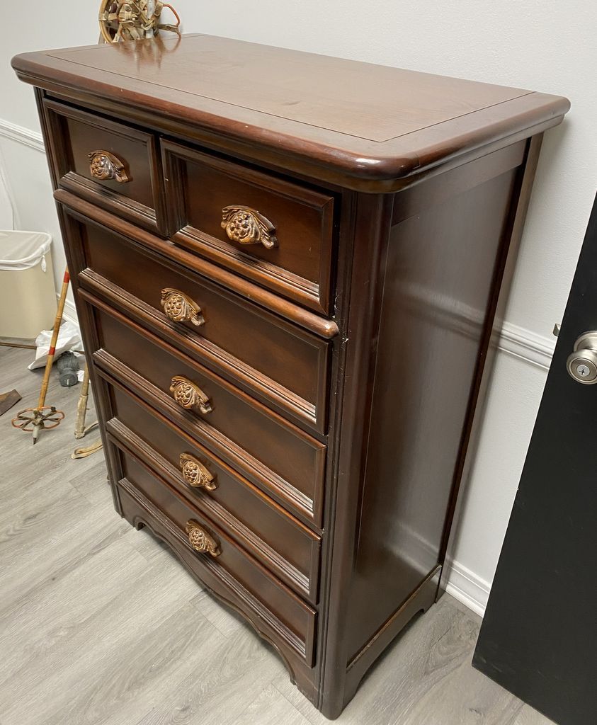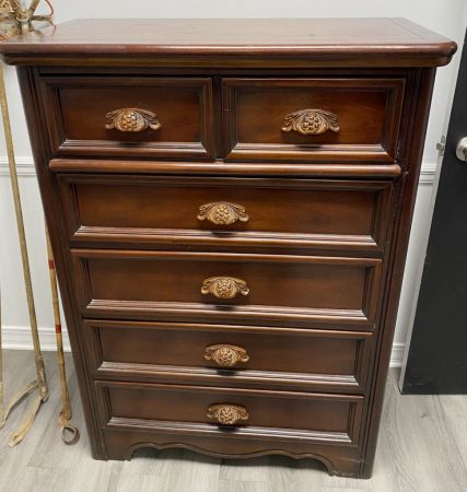 Dixie Furniture Co. Mahogany Chest of Drawers, 6 drawers, carved pulls, light wear, Location Middle Right Office Dixie Furniture Co. Mahogany Chest of Drawers, 6 drawers, carved pulls, light wear, Location Middle Right Office