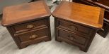 Dixie Furniture Co. Mahogany Night Stands, two drawers, carved pulls, light wear. Location Middle Right Office Dixie Furniture Co. Mahogany Night Stands, two drawers, carved pulls, light wear. Location Middle Right Office