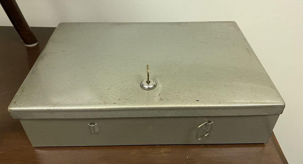 Metal Storage Box with key. Location Left Conference Room Metal Storage Box with key. Location Left Conference Room