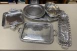 Group of Pewter Style Serving Pieces, trays, plates, bowls. Location Room by Kitchen Group of Pewter Style Serving Pieces, trays, plates, bowls. Location Room by Kitchen