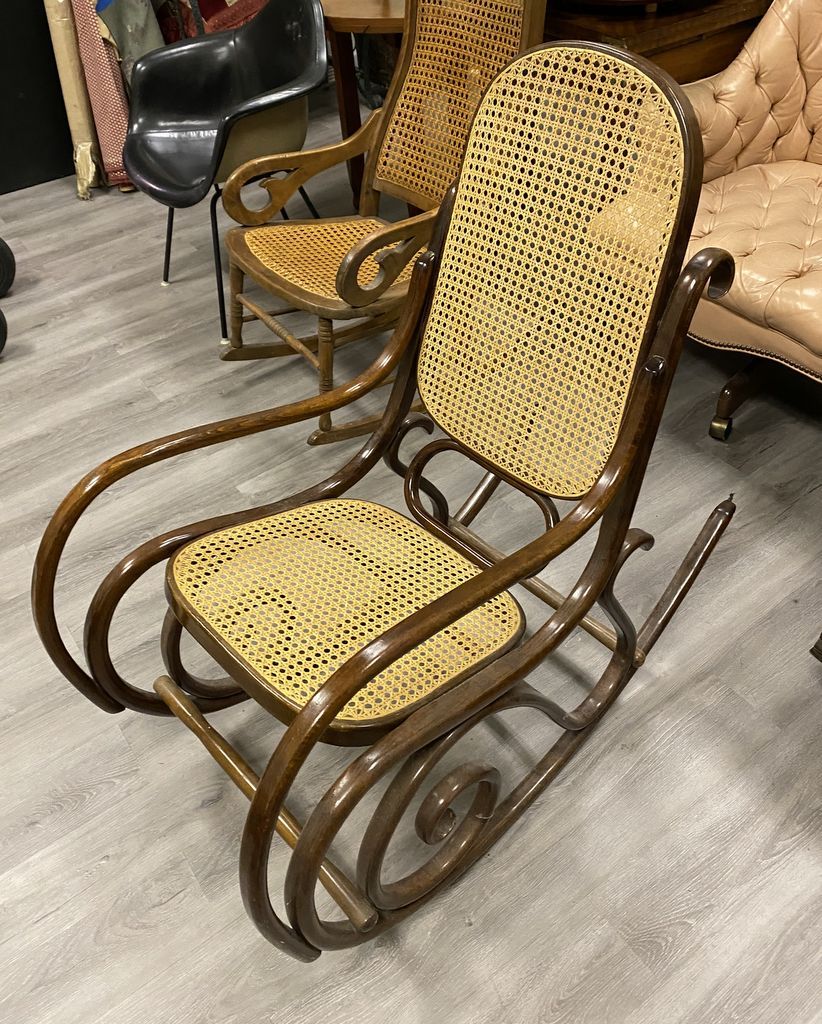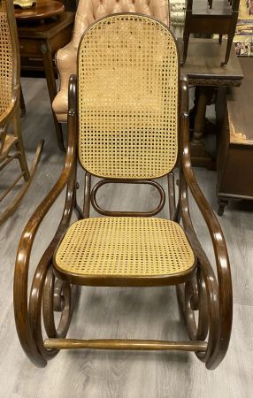 Mid Century Bent Wood Rocker, caned seat, good condition. 41" h., 20" w. Location Left Conference Room Mid Century Bent Wood Rocker, caned seat, good condition. 41" h., 20" w. Location Left Conference Room