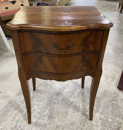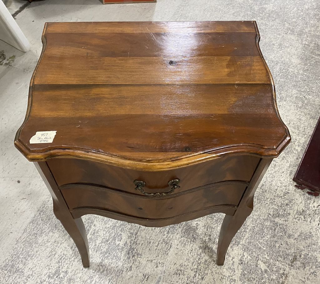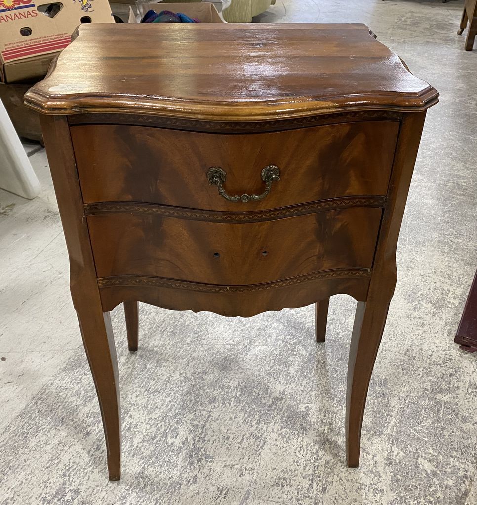 Mahogany French Style Side Table, two drawers, missing pull, 29"h., 19"w., 15"d. Mahogany French Style Side Table, two drawers, missing pull, 29"h., 19"w., 15"d.