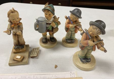 Four Hummel Figurines, vintage, two have damage, Location Back Right Office Four Hummel Figurines, vintage, two have damage, Location Back Right Office