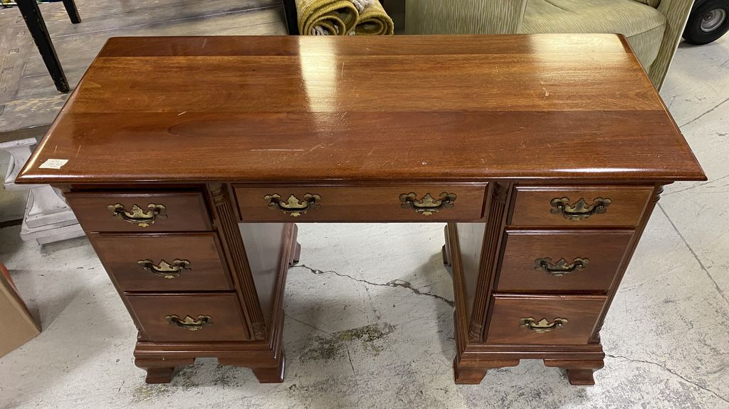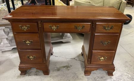 Hungerford Mahogany Vanity/Desk, 7 drawers, missing back leg, 30"h., 48"w., 19"d. Hungerford Mahogany Vanity/Desk, 7 drawers, missing back leg, 30"h., 48"w., 19"d.